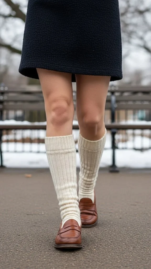 Long wool socks create a cozy, adorable vibe. Pair with loafers and a mini skirt for an outfit that’s playful yet warm. Layer thick tights under your socks to keep chilly toes snug. Buy thick socks on discount or find favorite pairs at thrift stores. This look works great for low-key winter outings.