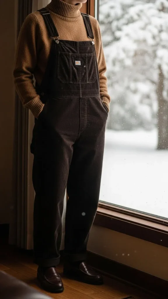 Swap jeans for corduroy overalls layered over a fitted turtleneck. This look adds vintage charm and is very comfortable. Overalls can often be found for less secondhand. Add simple boots or loafers to finish the look. For extra warmth, wear wool socks inside boots.