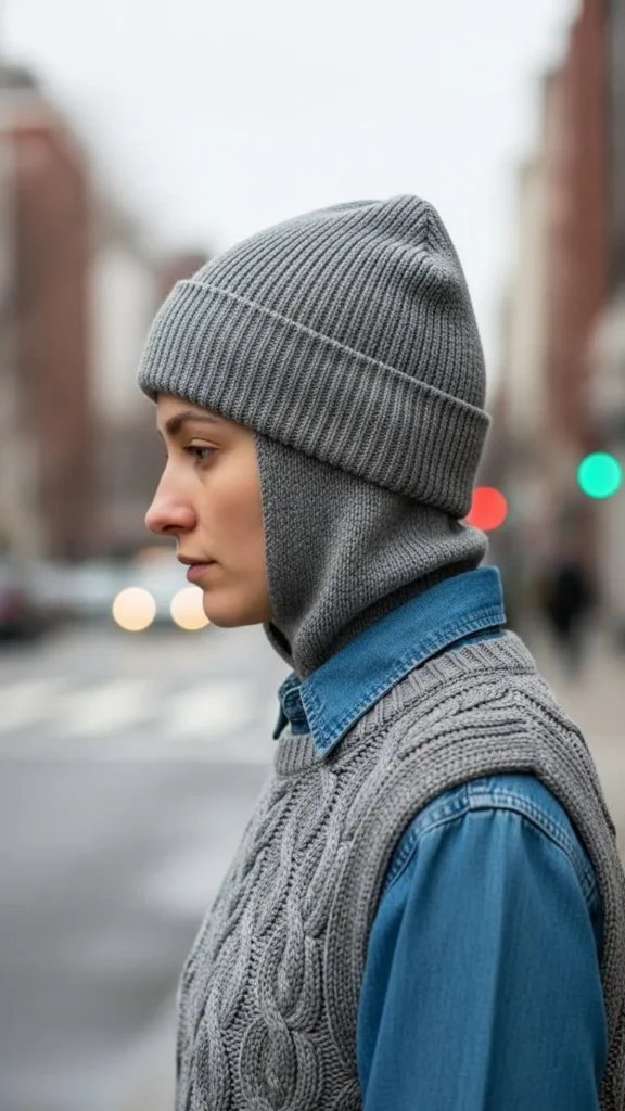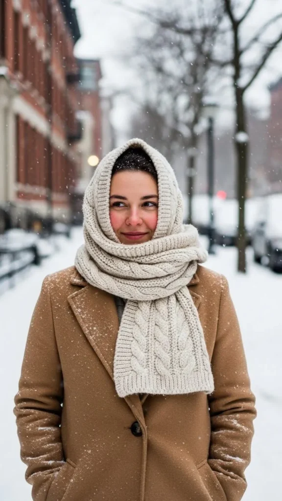 Cable knit headscarves are a stylish alternative to regular scarves. Pair with a long coat for warmth and a retro vibe. These can be knitted yourself or bought affordably online or at markets. The wrap keeps your neck and ears extra warm.