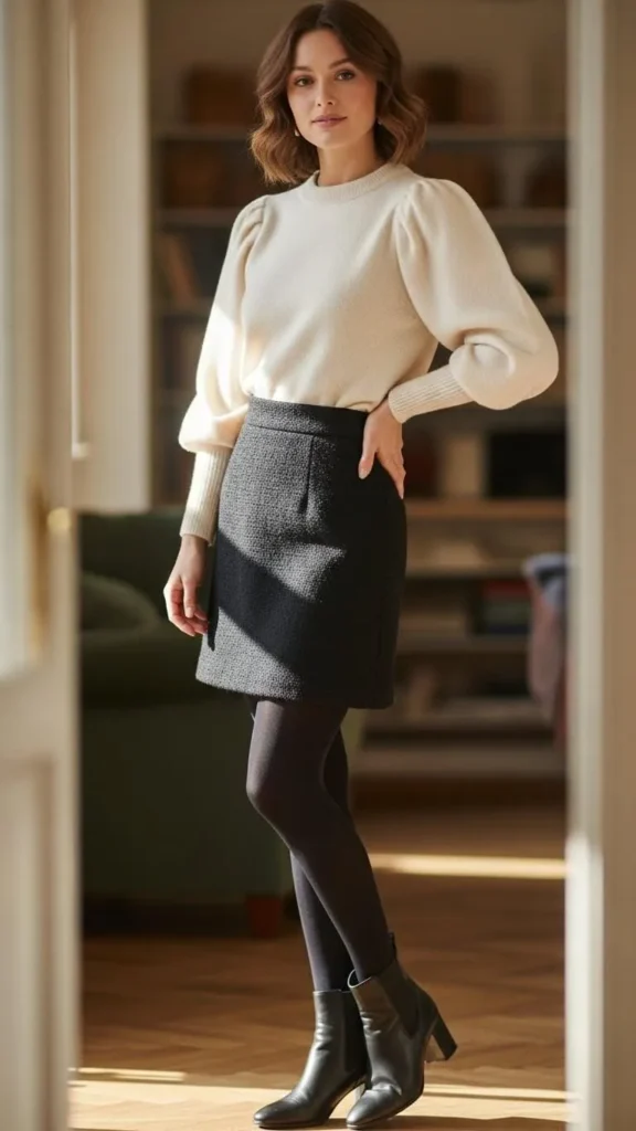 Puff sleeve sweaters add cute volume and pair perfectly with wool skirts. Tuck the sweater for a polished yet cozy look. Wool skirts keep you warm and are classic winter pieces. Look for on-sale basics or consider sewing a simple wool skirt from discounted fabric.