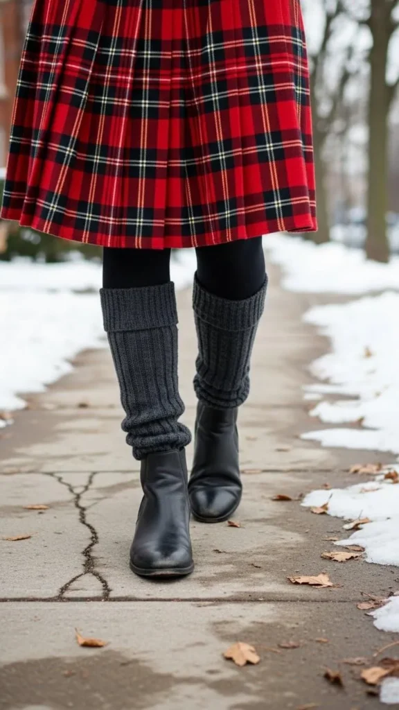 Plaid skirts are a winter favorite. Pair with wool socks, scrunched or pulled up, and ankle boots for a cute schoolgirl vibe. Layer thick tights underneath for extra warmth. Look for budget-friendly pleated skirts at thrift stores or online sales. You can add a simple pin or patch on your skirt for personalization.
