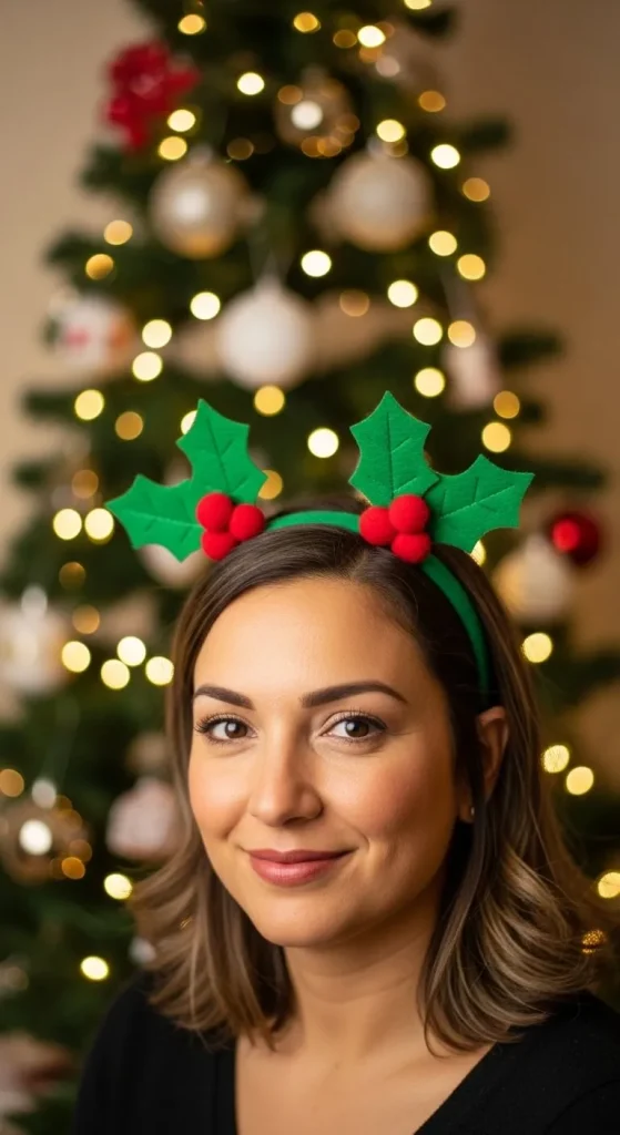 Make a festive headband by attaching holly leaves and berries made from felt to a plain headband. This simple accessory will complement any Christmas outfit and is perfect for a holiday brunch or a Christmas carol sing-along.