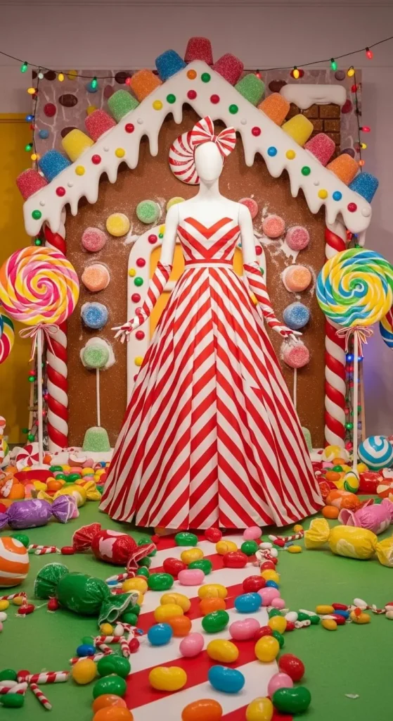 Create a candy cane-inspired dress by sewing red and white striped fabric into a simple dress shape. Add some puffed sleeves or a cute bow at the waist. This dress is sure to bring some sweetness to your holiday wardrobe.
