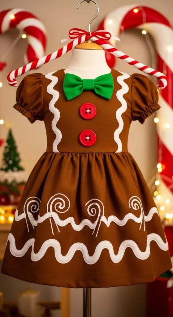 For a fun and quirky Christmas outfit, create a gingerbread man dress. Use brown fabric to make the dress, and then decorate it with white felt “icing” details around the collar and cuffs. Add felt buttons down the front for that perfect gingerbread touch. This dress will have everyone in the holiday spirit!
