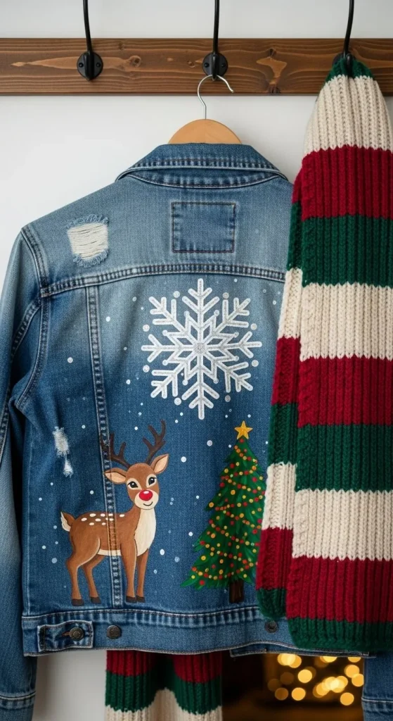 Transform a plain denim jacket into a holiday masterpiece by painting or sewing on holiday-themed designs like snowflakes or Christmas trees. This is a great option for a more casual Christmas look and can be paired with jeans or a skirt.
