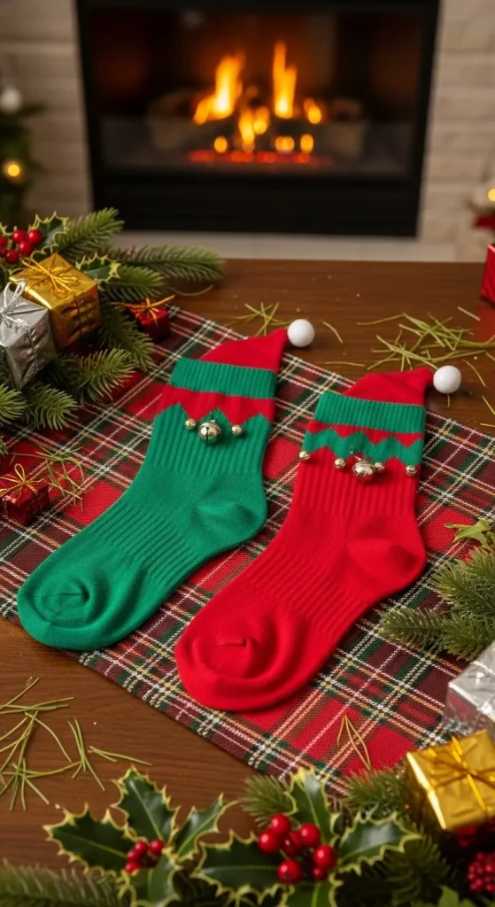 Transform plain socks into cute elf socks by adding colorful stripes and small bells around the ankle. These socks are a fun addition to your Christmas outfit and will make a festive jingle sound as you walk. They are also a great way to add a playful touch to a holiday pajama look.