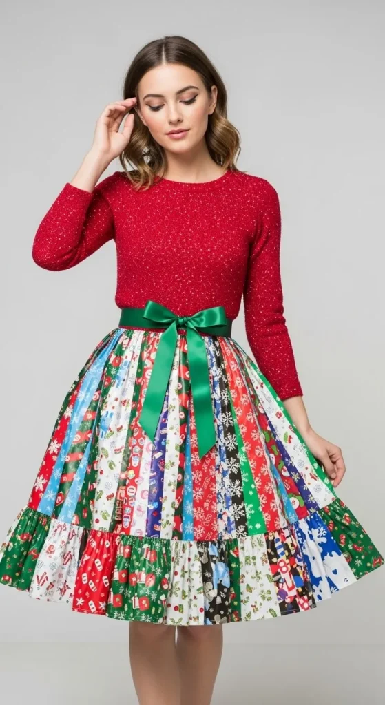 For a warm and stylish holiday look, make a snowflake sweater dress. Start with a simple white or light blue sweater dress and hand-sew large snowflakes using felt in different sizes. You can add glitter or tiny beads to make the snowflakes shimmer. Pair this dress with a woolen scarf and boots for the perfect winter outfit. It’s comfortable, chic, and embodies the spirit of the season.
