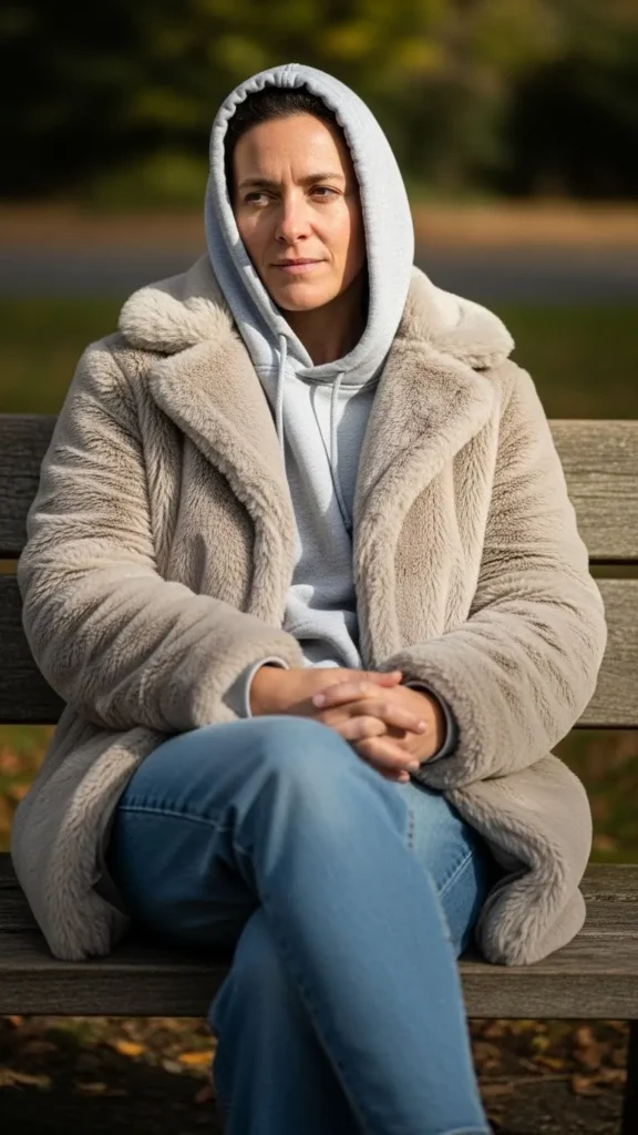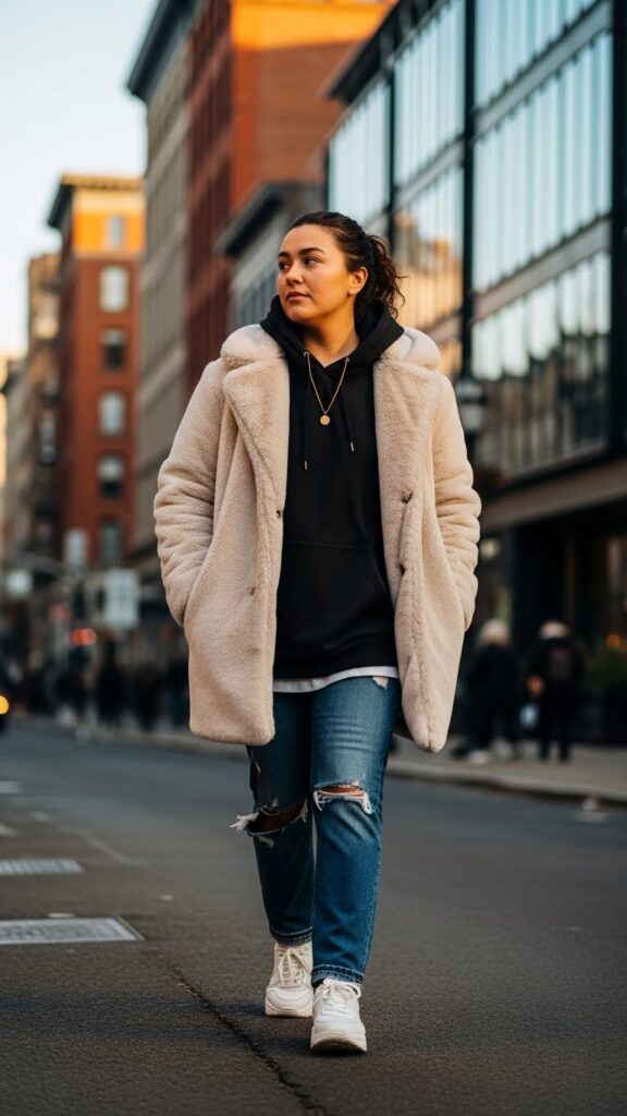 Throw a sporty hoodie under your faux fur coat to marry comfort with style. This layering looks naturally cool without trying hard. Pick hoodies in clean colors or with minimal graphics to keep the outfit grounded. This mix is an easy and affordable way to update casual wear for chilly days. Add sneakers or casual boots to finish the look on a budget.