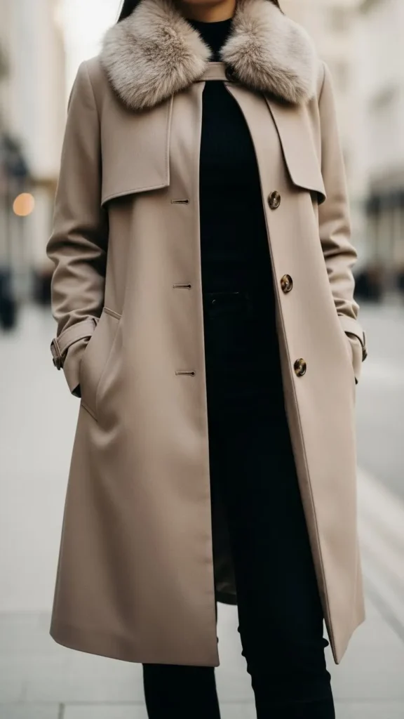Combine a classic trench coat with a detachable faux fur collar for a mix of tradition and warmth. This is a smart layering trick that can refresh your trench coat and add softness without buying a new full coat. You can DIY a faux fur collar with fabric from craft stores for an affordable upgrade.
