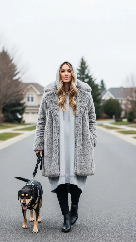 For ultimate comfort, layer your faux fur coat over a maxi hoodie and leggings. It’s cozy, doesn’t feel overdone, and works well for errands or travel days. This combo is wallet-friendly: maxis and leggings are cheap and practical. Add sneakers or slip-ons to finish your comfort outfit.