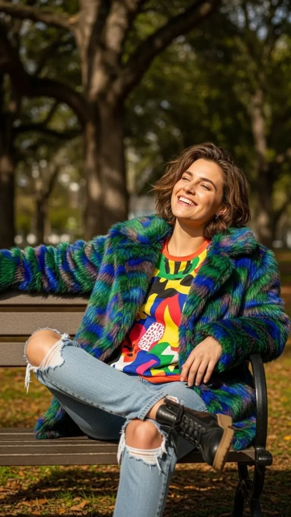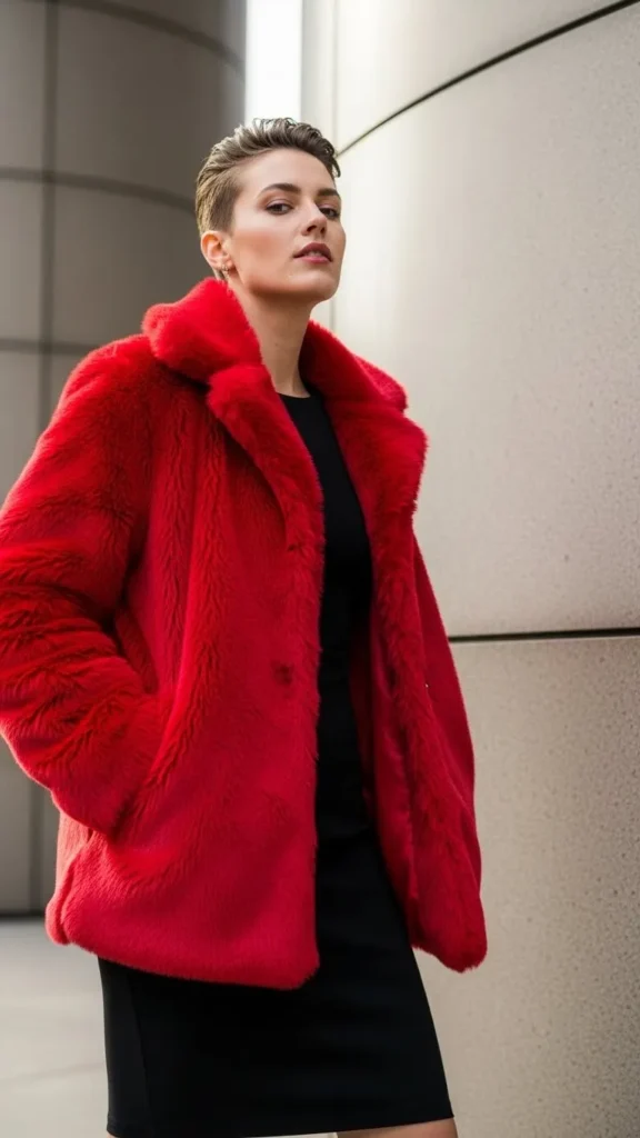 Brightly colored faux fur coats create instant impact. If you have a bold coat, keep the rest of your outfit neutral to avoid clashing. Shopping off-season or clearance sales will help you find statement pieces without spending a lot. If splurging on a color coat, look for quality to ensure long use.