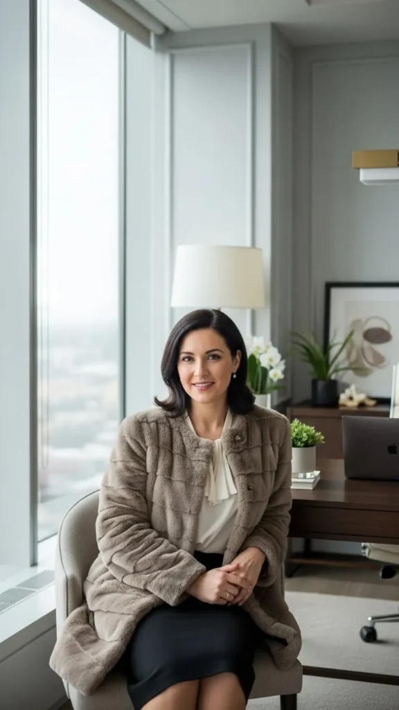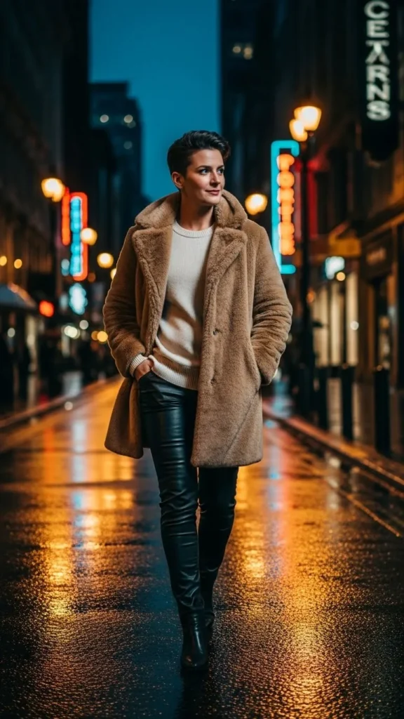 Your faux fur coat can work in professional environments when paired with structured pieces like a pencil skirt and blouse. Choose classic cuts and neutral colors for the best effect. This look doesn’t require buying new items—mix what you already have. Keep accessories minimal to maintain polish.