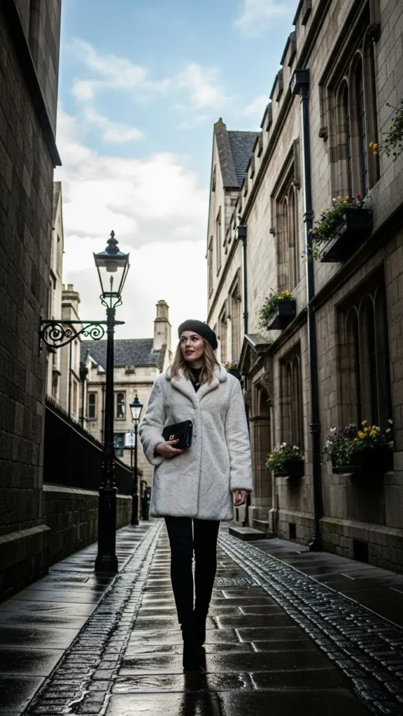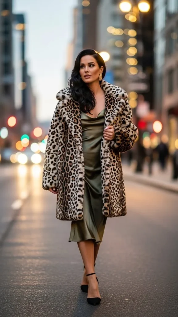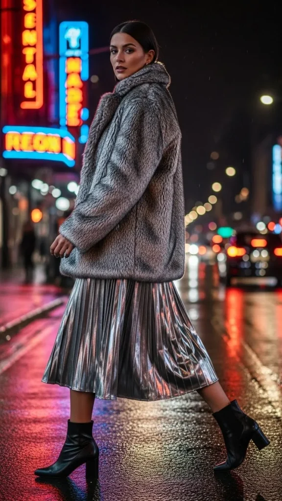 For party-ready vibes, mix metallic fabrics and faux fur. The shimmer contrasts beautifully with the plush coat. Metallic skirts or tops are often found on sale or thrifted at great prices. Keep shoes simple to avoid competing with your coat and metallic pieces.