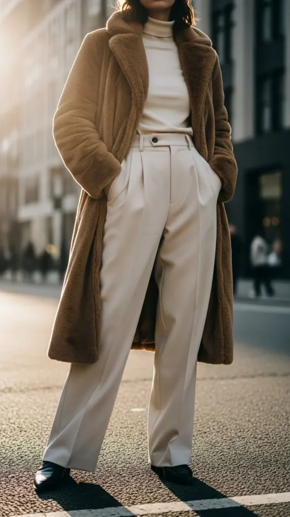 Wide-leg pants create a sophisticated silhouette against the fluffy heaviness of faux fur coats. Opt for neutral or earthy tones for an elegant, cohesive vibe. This pairing works great for office days or casual lunches alike. You can find linen or cotton wide-leg options that look expensive but cost less. DIY tip: cuff old trousers creatively for a cropped style that works well with loafers or ankle boots.