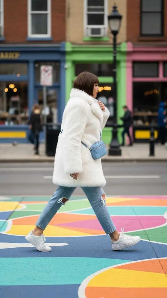 Sneakers keep the look light and casual, perfect for running errands or casual weekends. Pairing your faux fur coat with comfortable footwear like budget-friendly sneakers makes your outfit wearable all day. Find deals at outlet stores or online for affordable kicks. This style shows your coat doesn’t have to feel overly fancy.