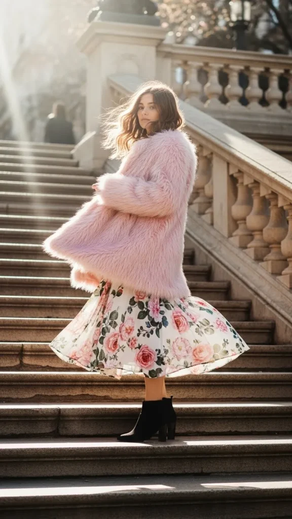 A printed midi skirt adds femininity and movement to the bulkiness of a faux fur coat. It creates a fresh, playful vibe. Stick to skirts with soft prints for versatility, and use boots or flats depending on comfort and budget. DIY: Update older skirts by hemming or pairing with new simple tops for a different look.
