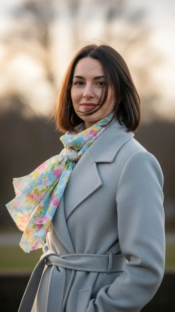 A wrap coat in cashmere or a blend feels luxurious yet soft. Choose pale neutrals like dove grey or light beige. Pair it with a floral silk scarf for a touch of delicate pattern. You can find budget-friendly scarves at thrift stores or fabric outlets, and repurpose old silk blouses to make your own scarf.