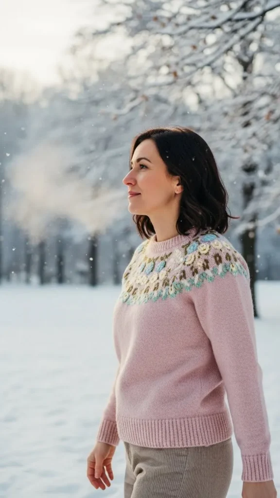 Embroidered sweaters add subtle romantic detail to winter wear. Pairing this with corduroy pants balances feminine with practical texture. You can DIY embroidery on plain knits with simple kits or buy embroidered pieces at thrift or outlet stores.