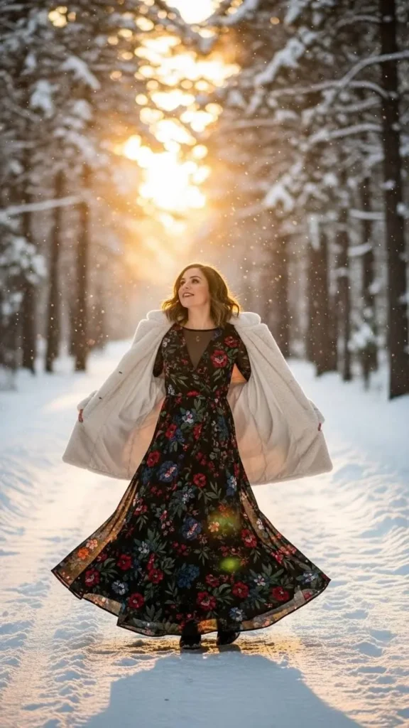 Maxi dresses with floral prints bring femininity to cold days when topped with a faux fur coat. Faux fur coats often come in budget-friendly versions and make striking winter outerwear.