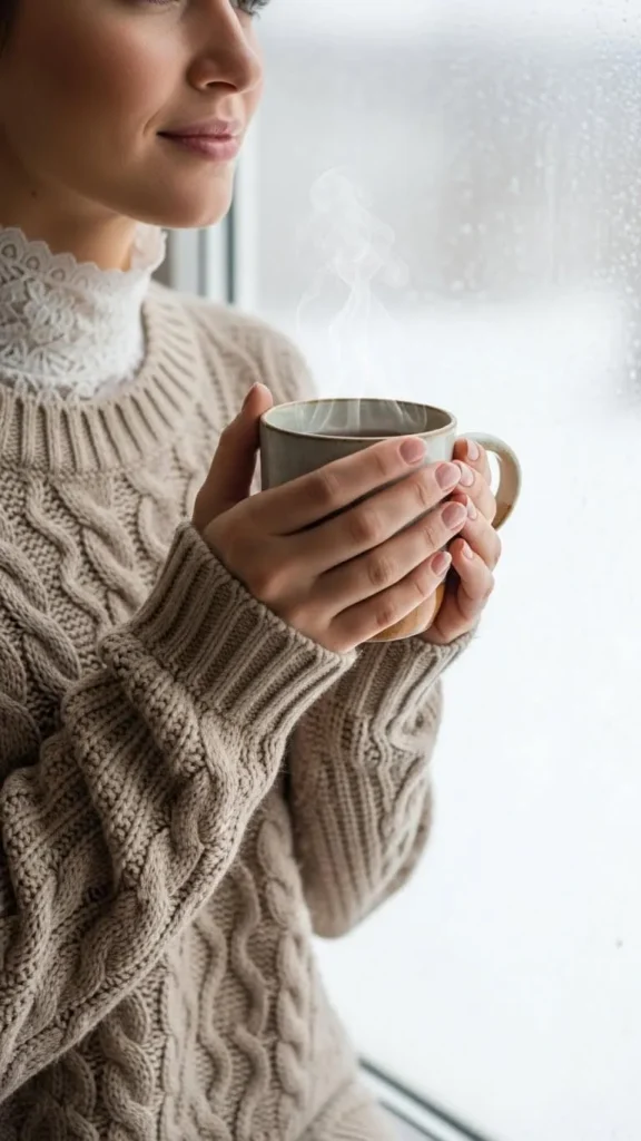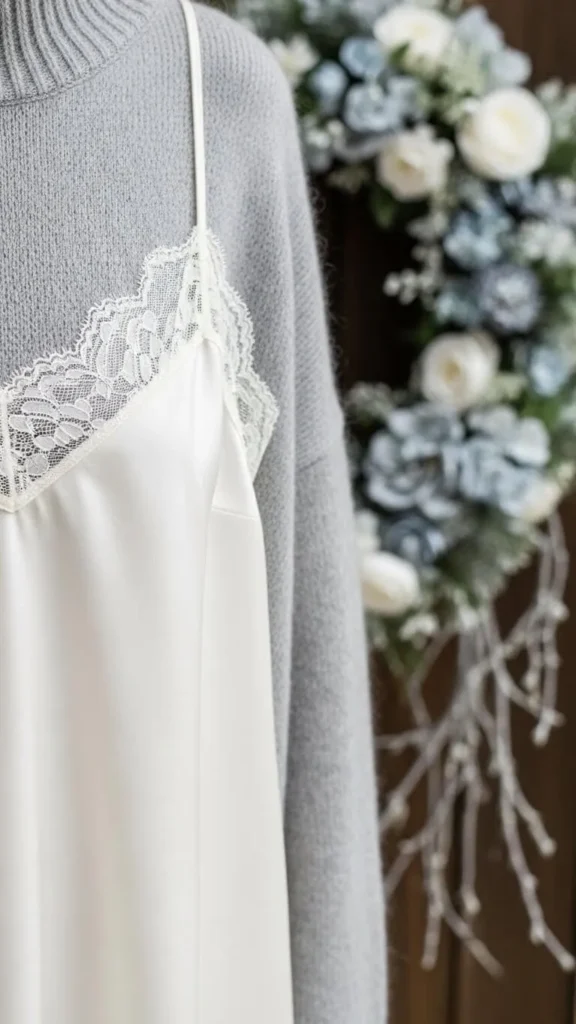 Add a delicate lace-trimmed turtleneck under thick, chunky sweaters for softness peeking out at the collar and wrists. Pick gentle colors like cream or soft gray to keep it feminine. Lace can be sewn in from old scarves or inexpensive trim bought online. This look works perfectly with jeans or bulky skirts for casual warmth with a romantic edge.