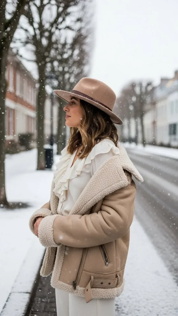16. Layered Ruffled Tops Under Shearling Jacket
