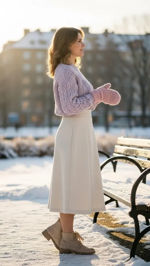 Start with a pastel sweater in soft yarns like cotton or acrylic blends. Pair it with a wool skirt that hits mid-calf for warmth and a romantic silhouette. High-waisted styles create definition without bulk. Add cozy ankle boots and simple gloves in unicorn colors like blush or lavender. You can DIY a wool skirt by repurposing an old blanket if you’re crafty.