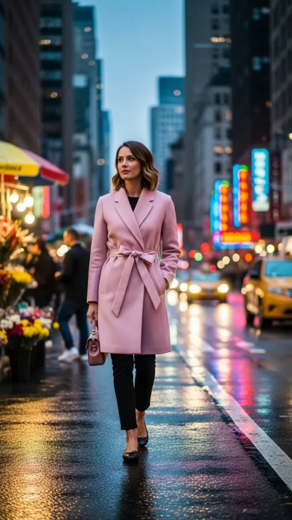 Coats with ribbon belts add a subtle romantic touch. A slim pant balances the volume of the coat without overdressing. You can swap belts on existing coats by sewing on or tying a satin ribbon. Ballet flats in soft leather or faux suede finish the look gently.