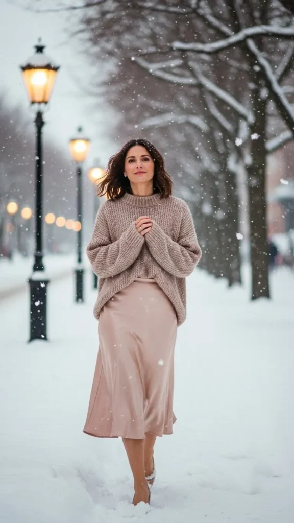 19. Satin Skirt Matched with Chunky Knit Sweater