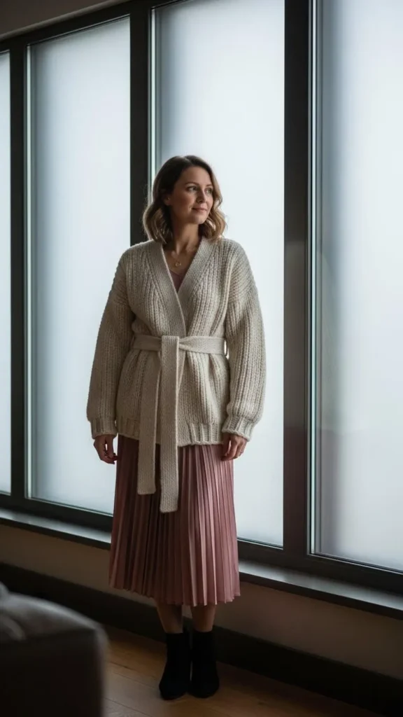 12. Soft Cardigan Belted Over a Pleated Skirt