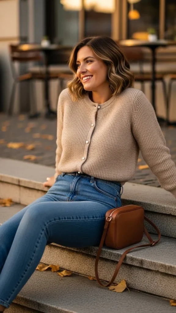 5. Soft Cardigan with Pearl Button Detail and Fitted Jeans