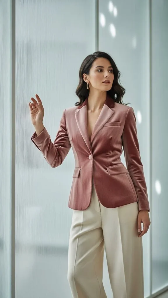 6. Velvet Blazer with Wide-Leg Trousers
