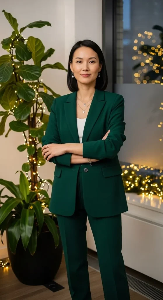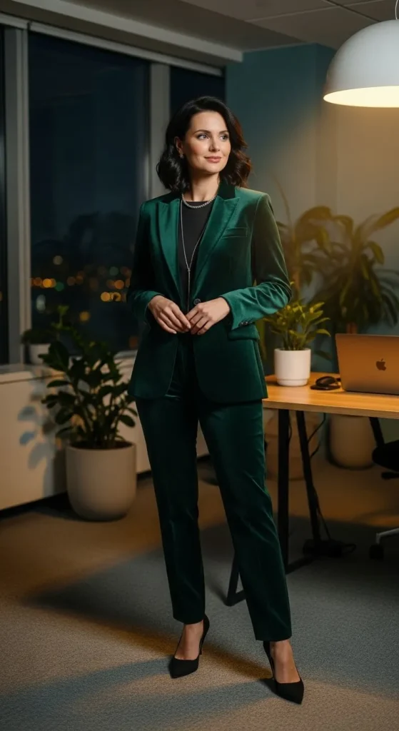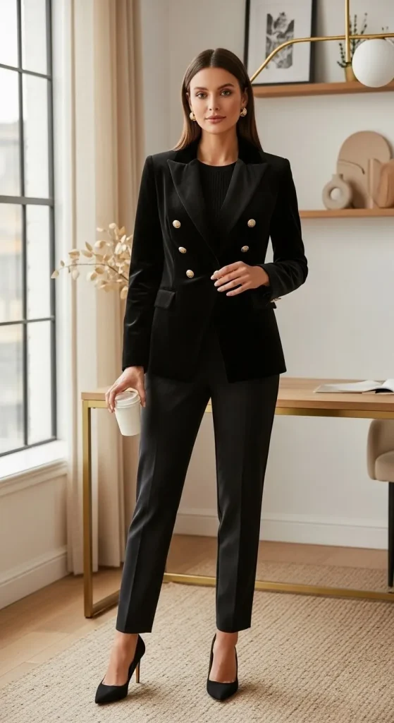 Velvet is synonymous with holiday elegance. A velvet blazer paired with matching trousers creates a smooth, polished look. It’s festive without being too flashy, making it perfect for work. Choose a deep color like navy or burgundy to add a seasonal touch. For an affordable DIY twist, consider buying a regular suit and swapping in a velvet blazer. Add a pair of pointed-toe shoes, and you’re ready for your event.