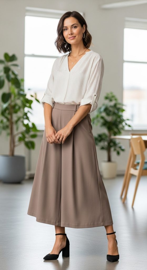 Culottes paired with a loose blouse is a great way to stay comfortable while still looking put-together. This outfit is trendy yet professional. Pair with block heels or flats to keep it office-friendly. Look for affordable culottes in neutral colors to keep the look versatile.