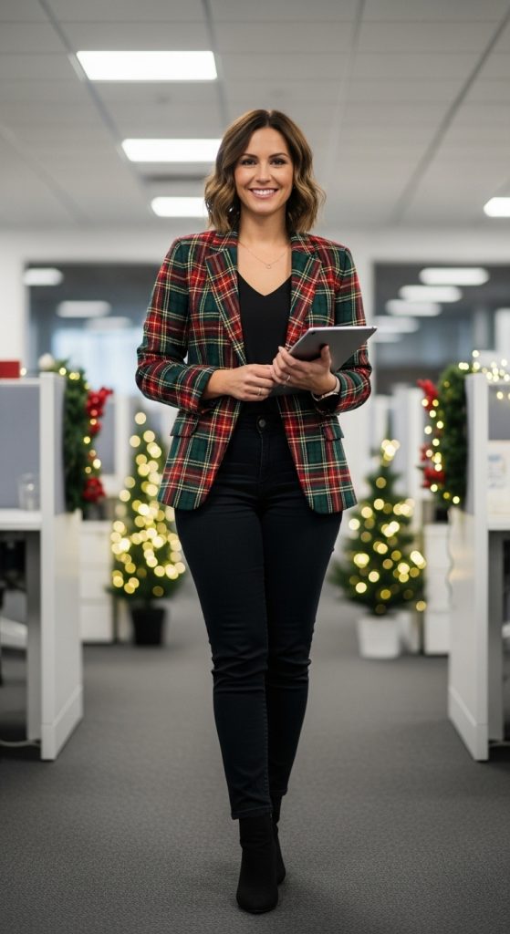 A plaid blazer with black jeans is a perfect way to add a festive touch while keeping things professional. Plaid is a classic holiday pattern, and the black jeans balance it out. For budget-friendly options, search for a plaid blazer at thrift stores or look for sales at retail stores.