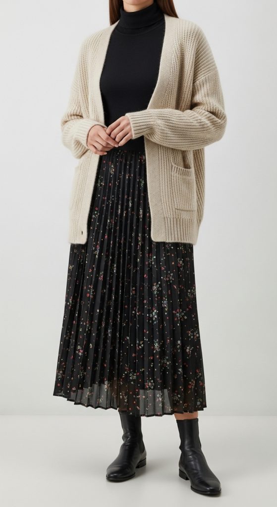 A soft cardigan paired with a pleated skirt creates a cozy yet festive outfit. The pleats give the skirt movement, while the cardigan adds comfort and warmth. Opt for a neutral cardigan that can be layered with different pieces. This is a practical and budget-friendly choice, especially when you shop for cardigans in cotton blends or knit fabrics.