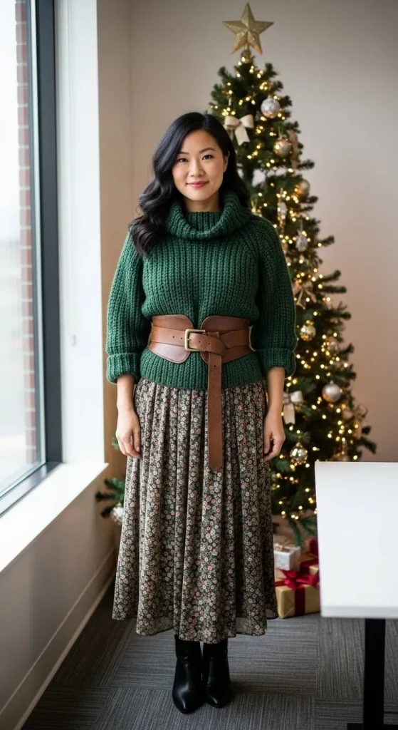 Pairing a midi skirt with a fitted turtleneck is a chic way to embrace the holiday season in a professional manner. A pleated or satin skirt can add a touch of festivity while keeping the outfit office-appropriate. Add a pair of ankle boots for a modern touch, or go for classic heels. Look for affordable midi skirts at high-street stores or thrift shops, which often carry vintage-inspired designs.