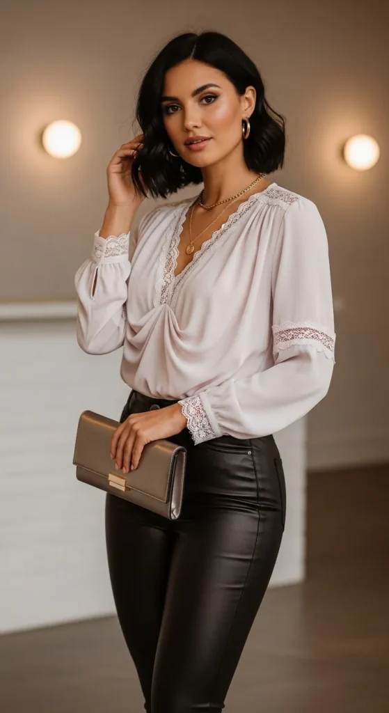 A blouse and faux leather pants combo provides a balance of chic and festive. Faux leather gives the pants a modern edge while keeping them office-appropriate. Pair with a blouse that adds a feminine touch, like a soft silk or lace material. Faux leather options are available at most high-street retailers, making this an affordable choice to upgrade your holiday attire.