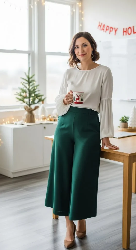 A sequin blouse paired with a classic green skirt is a perfect blend of festive glamour and office decorum. The sequins add sparkle without overwhelming the outfit. Choose a high-waisted pencil skirt for a flattering silhouette, and pair with simple black heels. For a budget-friendly option, you can repurpose a sequin top or purchase an affordable secondhand piece.