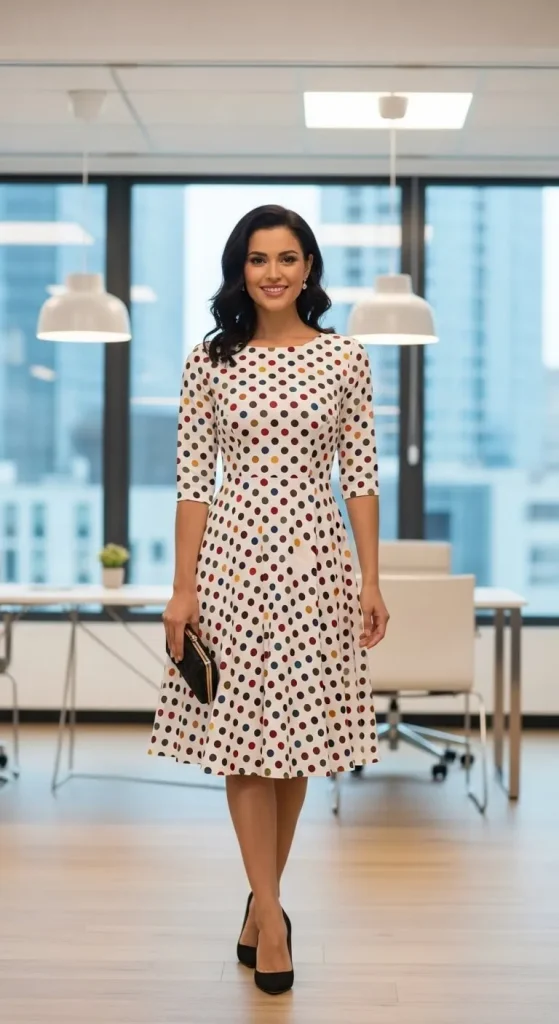 A polka dot dress is a fun, festive choice that works for work holiday events. The pattern is playful but still professional when styled right. Look for a midi or knee-length polka dot dress that doesn’t overwhelm the outfit. Pair with classic heels to keep it office-appropriate.