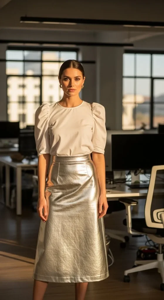 A metallic skirt is the perfect way to add a festive vibe without going over the top. Pair it with a crisp, simple blouse to balance the shine. A pencil or A-line skirt works well for professional settings. For a budget-friendly DIY, use a metallic fabric to make your own skirt or opt for a thrifted version. Keep the rest of your outfit understated to allow the skirt to take center stage.
