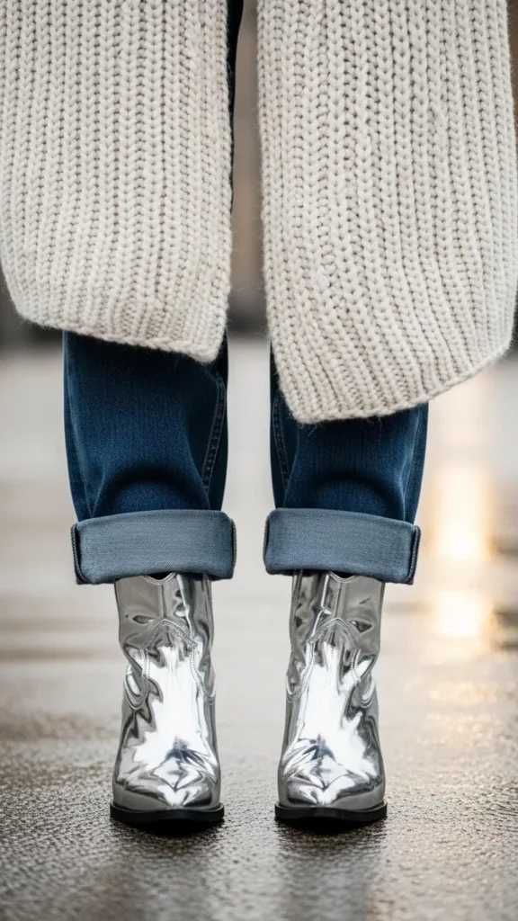 Sometimes the sparkle is in the small details. Pair metallic boots with your everyday jeans. Add a chunky knit scarf for warmth and scale contrast. Metallic shoes add instant interest to simple outfits. Look for sales after winter holidays for steals. Keep the rest of your outfit toned down for balance.