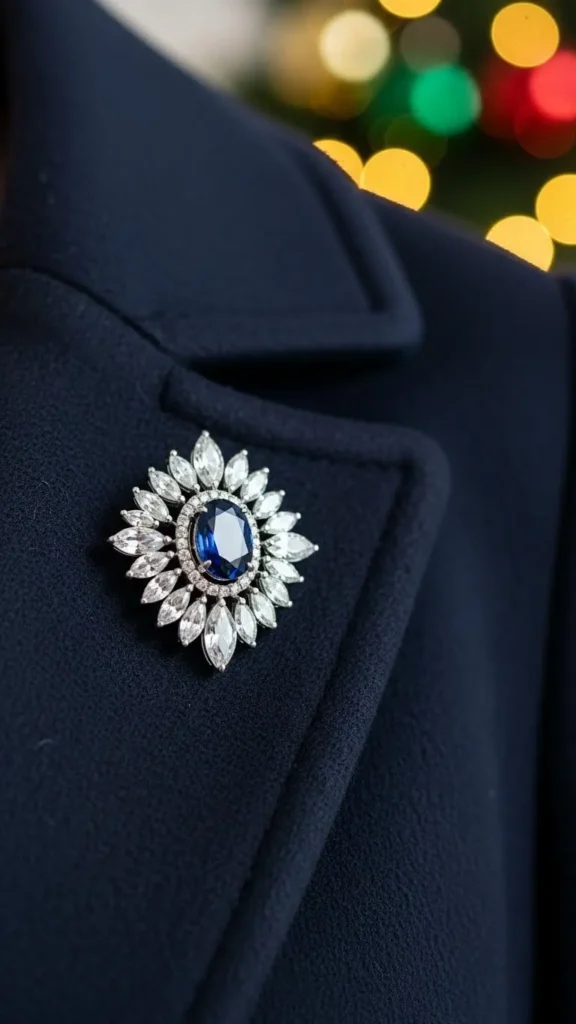 Give an old wool coat new life with a crystal brooch. It instantly adds sparkle and a personalized touch. You can find inexpensive brooches at craft stores or online. Pin one on your coat, scarf, or bag for festive flair without extra layers.