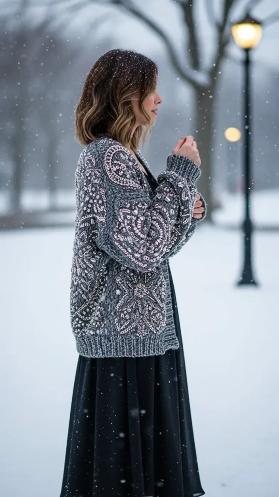 Turn a regular cardigan into a festive favorite by choosing one with embellishments like beads or sequins. Layer it over a midi dress for a mix of cozy and elegant. This can be a great way to repurpose dresses through the seasons. Add tights and boots to stay warm and comfortable.