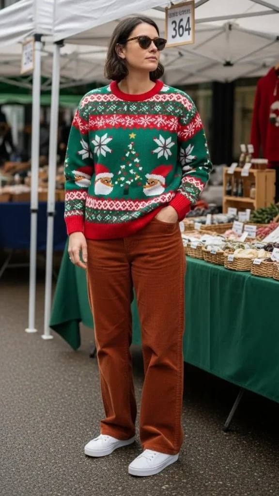 Get in the holiday spirit with a festive graphic sweater and corduroy pants combo. It’s fun, casual, and warm. Corduroy adds texture and looks great paired with sweaters. Look for sales or thrift cozy pieces you can mix and match.