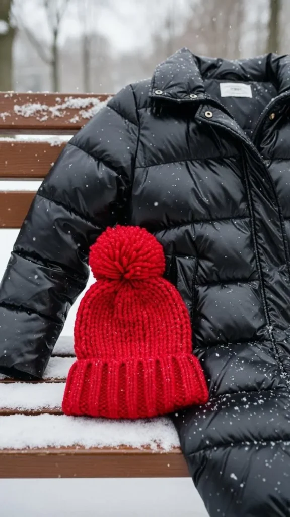Add fun and sparkle up top with a pom-pom beanie in festive colors. Match it with a shiny or metallic-finish puffer coat for warmth and style. Look for affordable beanies in holiday colors at discount stores. This look is playful but practical for cold weather outings.