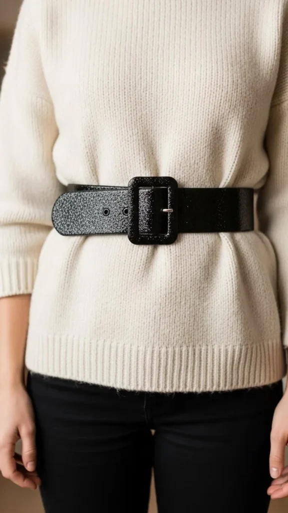 A glittery belt can redefine a chunky sweater’s silhouette. It adds sparkle without extra bulk. Belt your sweater over leggings or jeans. This simple update turns a casual look festive. Look for belts with metallic thread or rhinestones at discount stores.