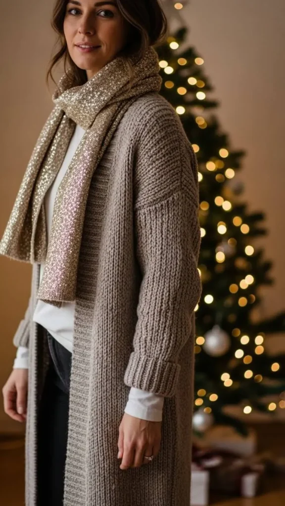 If you want simple sparkle, start small with glittery accessories—scarves, gloves, or bags. Layer over neutral sweaters and jeans or leggings. This is budget-friendly and lets you reuse your casual staples with subtle glam. Craft store glitter scarves can be DIYed by gluing loose glitter flakes onto a basic scarf.