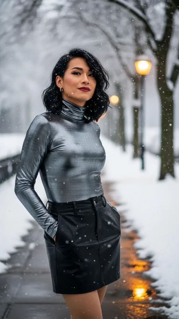 Pair a leather skirt with a metallic turtleneck for a sleek, modern twist. The textures contrast nicely and give subtle shine. Leather skirts can be faux to stay affordable. Keep accessories simple so the focus stays on the outfit.