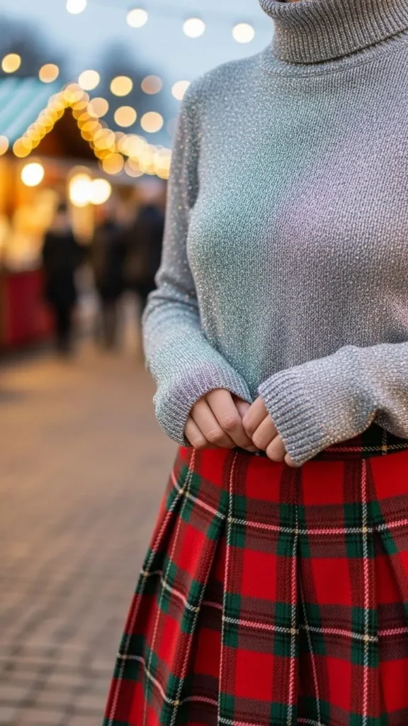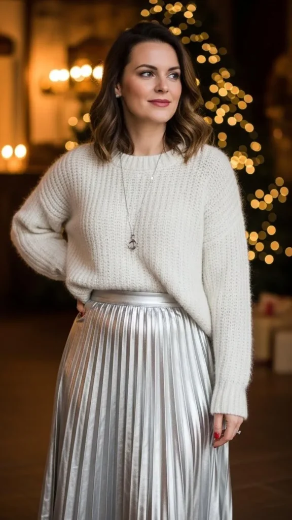 Metallic skirts add instant sparkle and pair well with cozy basics. Combine a metallic pleated skirt with a chunky knit sweater to balance shine with softness. Tuck in the sweater or wear it loose depending on your vibe. Add glittery flats or simple winter boots. You can DIY metallic skirts by using shiny fabric paint or adding metallic thread to old skirts.