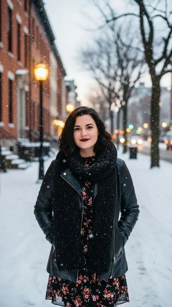 Pair a printed winter dress with a black faux leather jacket to add personality and subtle shine. This combo can be casual or dressy depending on accessories. Use tights and boots to stay warm. This is a smart way to rework summer dresses into winter outfits.